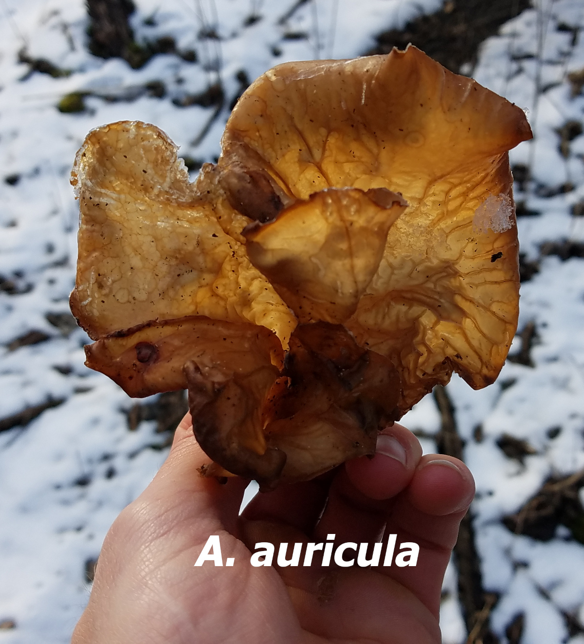 This is one of the few fleshy mushrooms that can be found within a day of frozen temps. I have a theory that it dehydrates in warm temps, freezes, then rehydrates when the temps get warm which makes it appear like it grew in freezing temps. JUST A THEORY! This mushroom is edible with a distinct texture and is fun to add to Asian-type recipes.